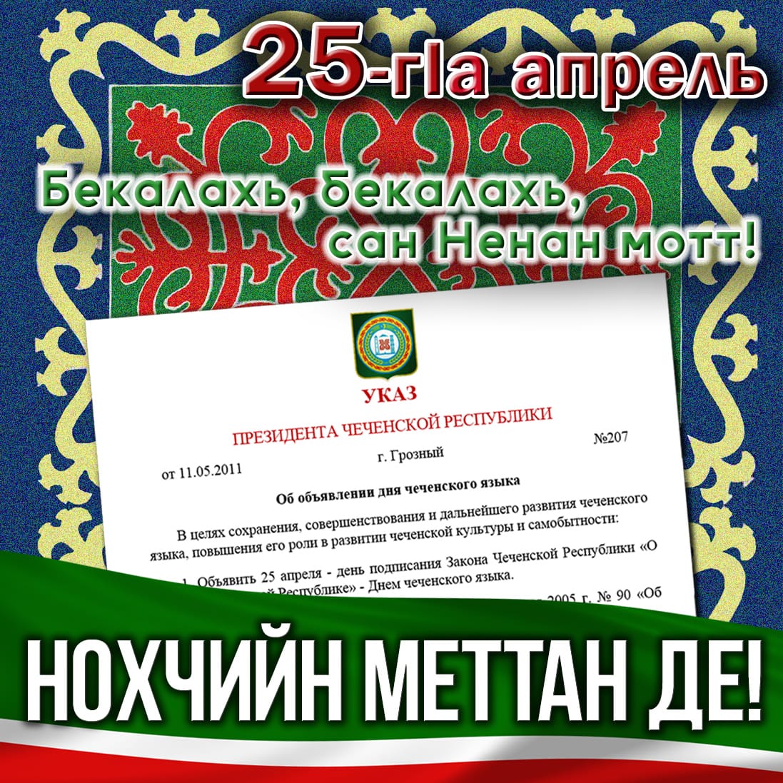 Мы поздравляем с этим праздником весь чеченский народ. Желаем бережно относиться к родному языку, сохранять его и изучать, поскольку национальный язык народа - это фундамент его культуры, самобытности и менталитета.