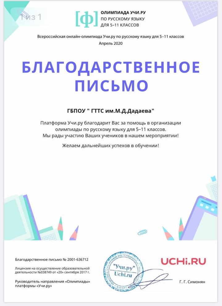 27.04.2020Учи.ру - интерактивное пространство, позволяющее получать дополнительные задания по школьным предметам. Учащиеся проходят программу в удобном для себя темпе, показывая существенно лучшие результаты обучения. Студенты Грозненского технологического техникума сервиса имени М.Д.Дадаева, находясь на карантине, активно участвуют в дистанционном обучении на портале Учи.ру. За активное участие студентов в различных олимпиадах, техникум отмечен Благодарственным письмом портала Учи.ру.