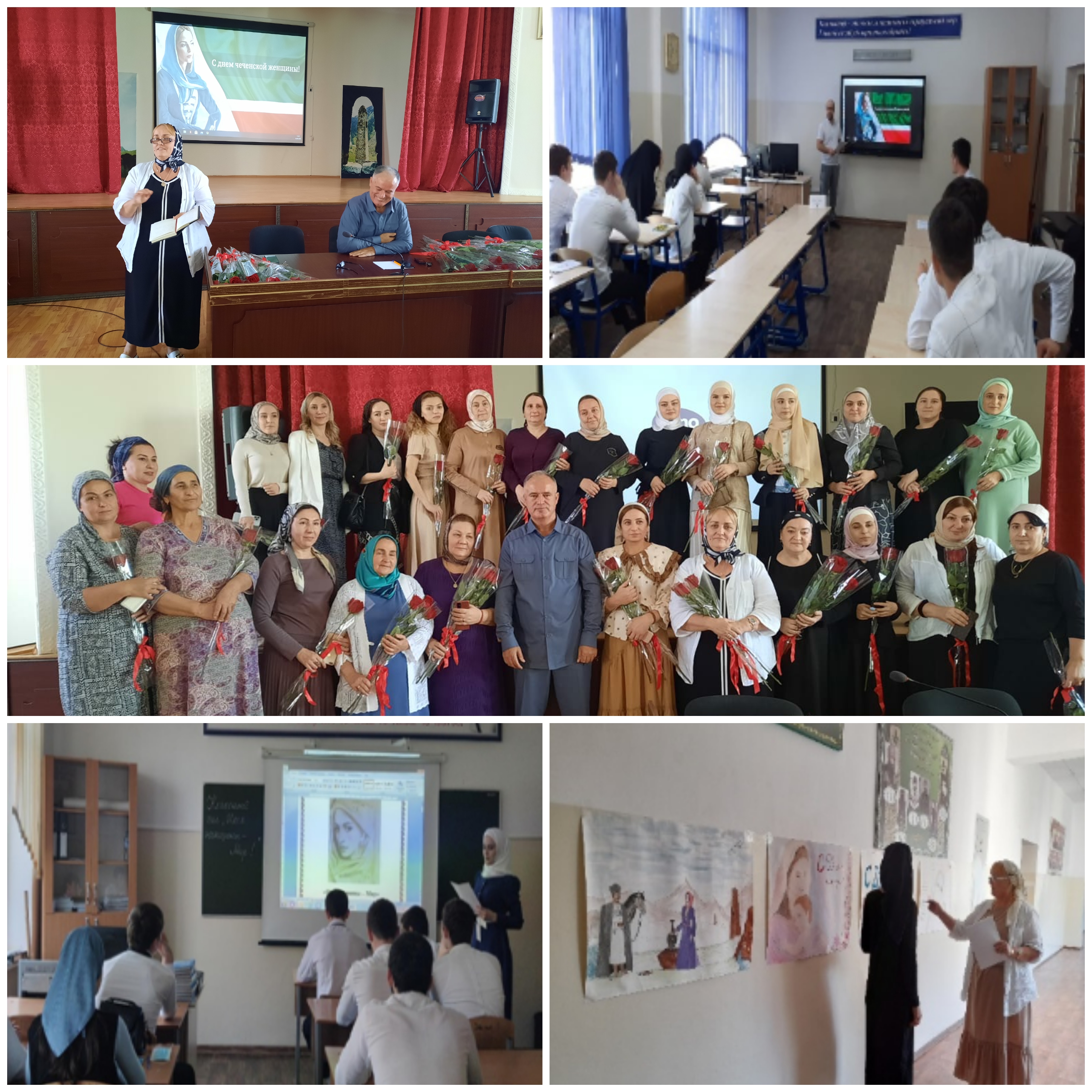 В актовом зале колледжа торжественное собрание, посвященное Дню чеченской женщины. Всем женщинам подарили цветы.