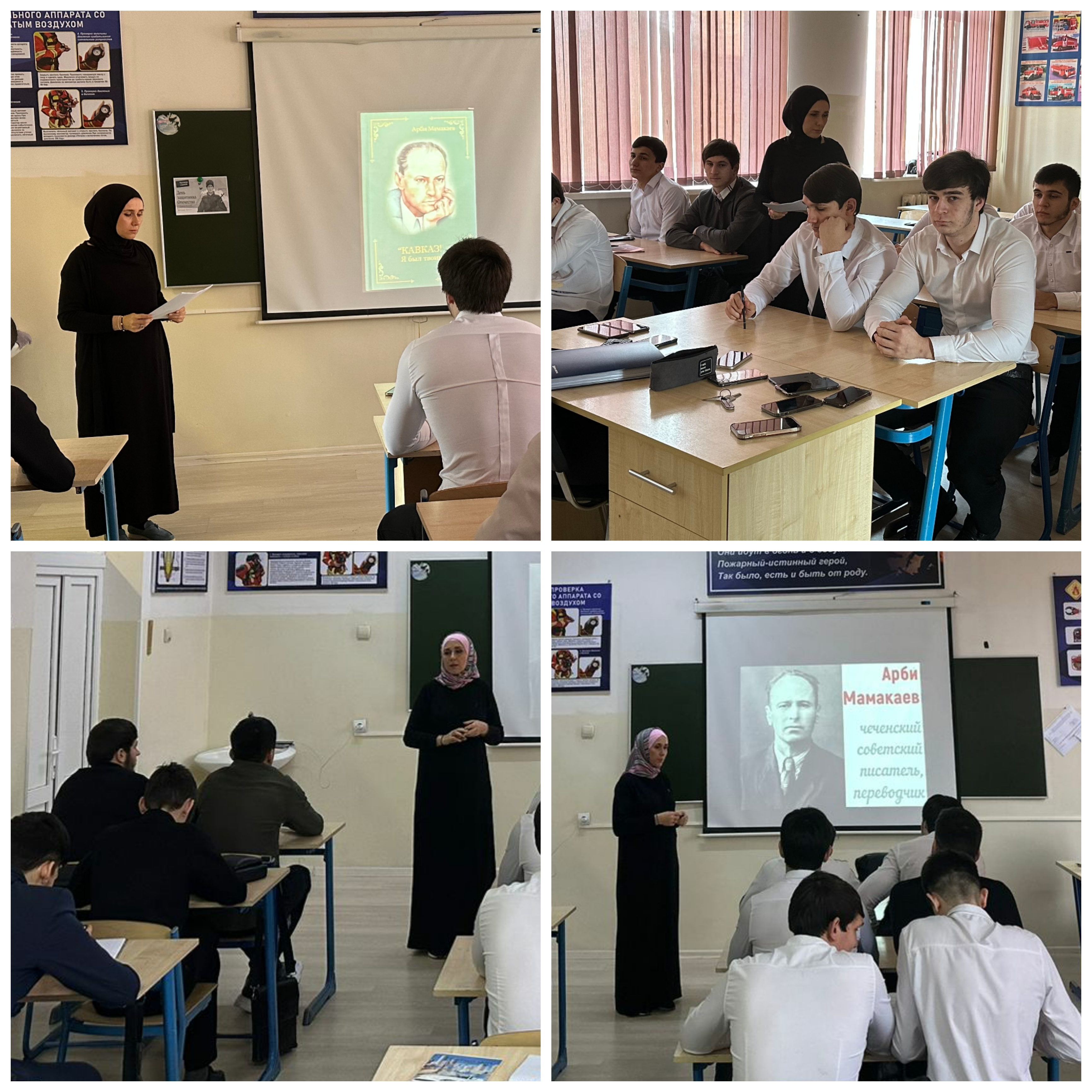 Обучающиеся посмотрели сюжет о памятнике Арби Мамакаеву и об улицах, названых его именем в городе Грозном и селении Автуры. Куратор рассказала, что в Грозном на доме по улице имени Арби Мамакаева, 1 установлена мемориальная доска с текстом на русском и чеченском языках.