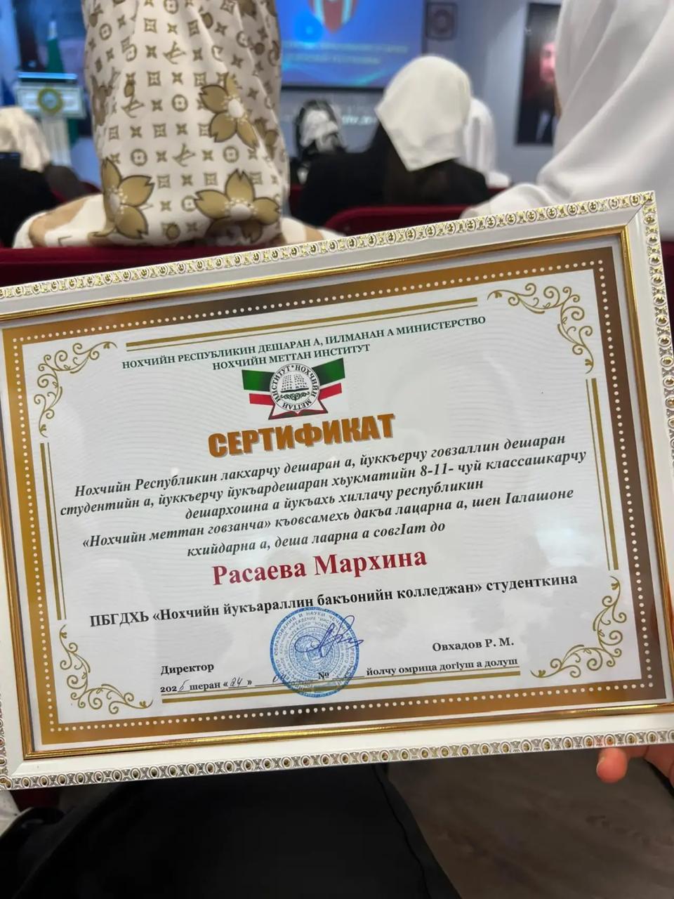 Студентка «Чеченского социально‑правового колледжа» Расаева Марха, приняла участие в республиканском конкурсе «Лучшее сочинение на чеченском языке».Этот конкурс — значимое событие для сохранения и развития чеченского языка и культуры. Участие в таком конкурсе — это не только проверка знаний и литературных навыков, но и важный вклад в сохранение культурного наследия.